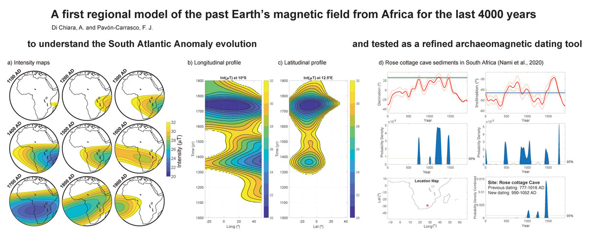 Lo studio è stato il frutto di una collaborazione con l’Università di Madrid. Contiene una prima parte di analisi dei dati e una seconda parte di modellazione vera e propria, realizzata proprio dal Dottor Javier Pavon Carrasco dell’Università spagnola. Il lavoro presenta il primo modello paleomagnetico del campo magnetico terrestre relativo all’Africa degli ultimi 4.000 anni. L’idea iniziale, in realtà, era quella di arrivare a coprire tutto l’Olocene (ovvero gli ultimi 12.000 anni), ma i dati disponibili erano veramente pochi, quindi in questa prima fase ci siamo concentrati su una finestra temporale minore.