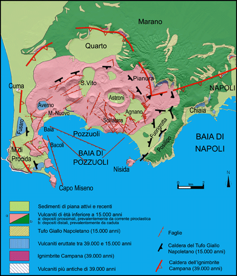 La ricostruzione della storia eruttiva dei Campi Flegrei ci dice che questo vulcano produce tendenzialmente delle eruzioni esplosive, preferibilmente di media e piccola taglia, con rarissime eruzioni effusive: basti pensare che negli ultimi 15.000 anni ci sono state più di 70 eruzioni, e di queste solamente quattro sono state effusive.