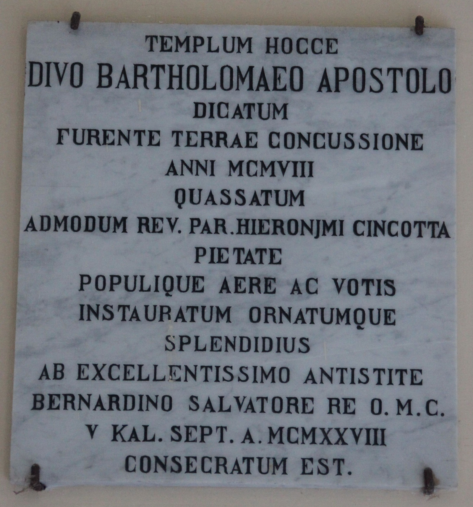 La seconda testimonianza si trova a Stromboli, nella Chiesa di San Bartolo, frazione di San Vincenzo. Qui è esposta una lapide che ricorda che la chiesa è stata restaurata dopo il terremoto di Messina del 1908, evento che a Stromboli ha raggiunto il settimo grado della scala Mercalli.